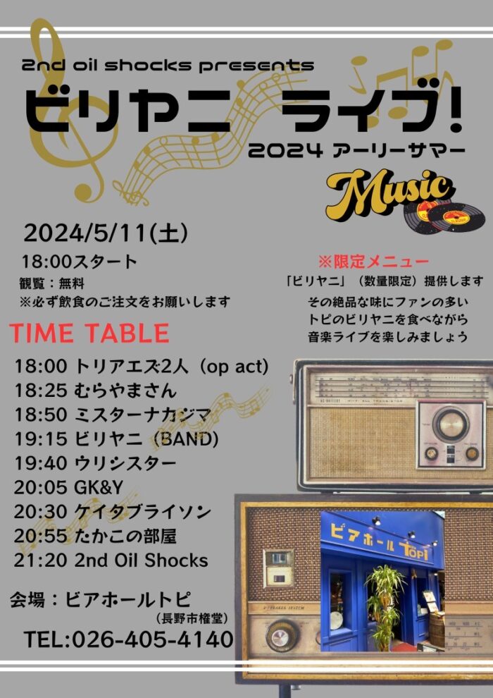 17:30 OPEN 18:00 START 入場・観覧無料 音楽と美味しいゴハンでニコニコなイベント! 普段は無い、特別メニュー「ビリヤニ」もお楽しみにー♪
